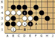 여러가지 잔꾀를 부리지 않고 흑1로 바깥 공배를 메우는 것이 이런 경우 좋은 수. 백2는 당연한 수로 이것은 살아있는 모양처럼 보이지만, 흑3으로 젖히고 백4로 막으면 다음 수가 포인트다. 흑A로 이으면 백B로 간단히 산다고 한다면.....