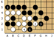 흑1로 내려서는 수가 맛있는 수. 백은 2로 한번 끊은 다음 4로 단수 쳐 반응을 본다. 이 경우는 적절한 기교이지만 흑5로 백을 단수 쳐 대단히 얄궂게 되어버린다.