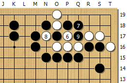 백6에는 7로 빠지는 수가 좋다. 백8로 9에 잇는 순간 흑8로 백이 잡힌다.