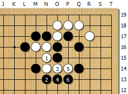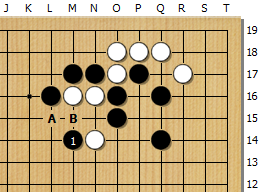백A에 끊기는 수단이 있어 흑1로 안전하게 호구 이음하였다. 물론 부분적으로는 괜찮은 수단이지만, 전체적인 상황을 간파하지 못하고 있다.