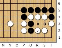 흑1은 백2로 수가 되지 않는 것은 명백하다. 또한 흑1로 A는 백B로 그만.