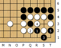 어쨌든 흑1의 모붙임외에는 없다. 백2의 단수에 흑4로 잇는 것은 아무 것도 되지 않는다. 흑3부터 5까지 단수쳐 <패>를 만든다.