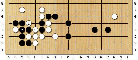 쌍립 자리인 백1로 찝는 것이 맥. 흑은 부득불 2에 이어야 하는데, 이 때 백3으로 흑 두점을 잡을 수 있다.