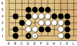 또 흑1로 한칸 우측에 내려서는 수는 생각이 부족한 수. 백2 이하 흑5까지의 형태는 이른바 꽃놀이 패 . 백은 <패>싸움에 져도 <빅>이 보장되어 있다.