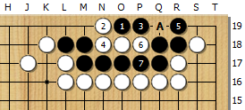 좌우 동형은 아니지만, 비슷한 모양이기 때문에 중앙에 붙인다. 흑7까지 흑생. 다음 백A는 흑3으로 되따낸다.