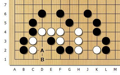 문제12 문제도(흑선) 흑A의 모붙임은 백B로 젖힘을 당해 꽃도 열매도 없다. 흑이 살아나고 백이 잡히는 결과가 되어야 한다. 정해도 흑1이 맥이다. 흑5까지 간단히 백이 잡힌다. 백2로 5는 흑4로 끊어 백을 잡는다. 橋本宇太郞/中仙道 2023.12.27