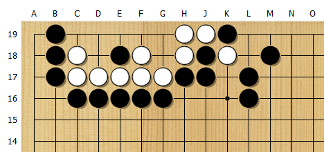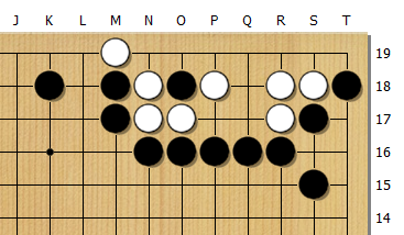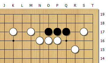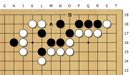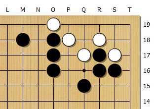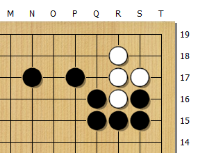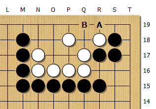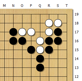 문제도(흑선) 결과는 비교적 간단하지만, 흑이 무조건 대들면 백이 살고, 거꾸로 백이 살려고 발버둥치면 잡힌다. 정해도(흑선패) 흑1이 쌍방 급소. 백2면 흑3으로 가 정답. 흑1로 3에 먼저 젖히면 백1에 두어 살 수 있다. 변화도(백사) 흑1에 백2로 를 면한다해도 흑3, 5로 잡힌다. 백A, 흑B, 백 이음, 흑C로 되어 결국에는 로 백이 잡힌다. 실패도(백삶) 수순을 달리하여 흑1에 먼저 두면 와 달리 백은 2로 따낸 다음 흑3 때 백A에 두지 않는다.